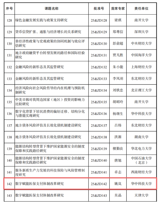12月19日,全国哲学社会科学工作办公室公布了2025年国家社科基金重大项目立项名单。医管院院长姚岚教授主持的课题“数字赋能医保支付体制改革研究”(批准号:25&ZD142)获得立项支持。