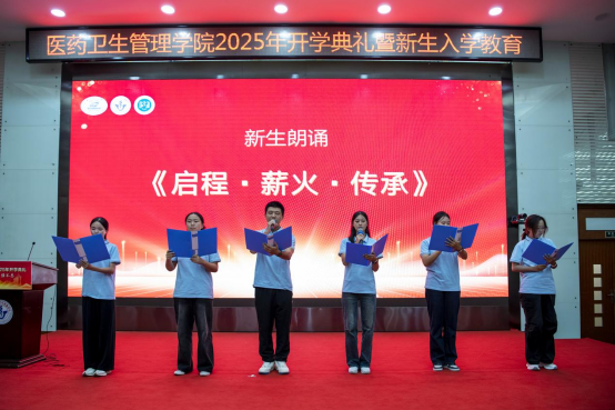 2025级本科新生代表深情朗诵《启程·薪火·传承》。同学们以铿锵有力的语调、饱含深情的演绎,表达了将个人求学志向融入健康中国建设的决心,彰显了医管学子扎根实践、守护民生、服务国家战略需求的责任与初心。