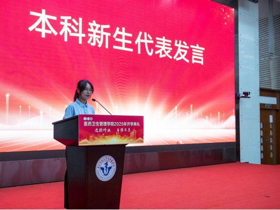 本科生新生代表、信息管理与信息系统专业2025级本科生周语涵围绕“逐梦华科大、学在华科大、不负华科大”分享了初入华科大的憧憬,表示将努力成长为有担当、有本领、有温度的医管人,希望能为健康中国建设和民族复兴征程贡献力量。