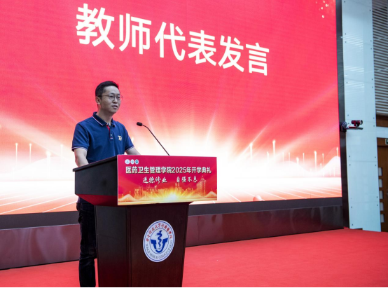 教师代表、医药信息管理系副主任向菲副教授表示“为党育人、为国育才”是老师们的责任,愿为同学们提供坚定前行的力量。他认为幸福应该是自内而外、积极向上、利己利他,希望与同学们携手,做正直善良的人,做负责任的工作,做利国利民的科研。