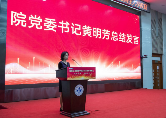 院党委书记黄明芳作总结发言。她首先对全体新生的到来表示热烈欢迎和衷心祝贺。希望同学们珍惜在华科大、在医管院的学习时光,将个人理想与国家需要和民族命运紧密结合,时刻瞄准国家重大战略需求和人民群众健康需求,用实际行动诠释“强国有我、健康中国有我”的誓言。
